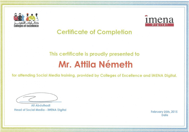 Szaúd-Arábiában, a világ az egyik legnagyobb internet- és közösségi média használattal rendelkező országában új szakképző intézmények felállítása és elindítása volt a feladatom 5 képzési szakember vezető-társammal közösen, ahol a tanszékvezetői feladatok ellátása mellett rám hárult az informatikai rendszer, valamint a weboldal, Facebook és Twitter csatornák, azaz az online marketing létrehozása, tervezése, kivitelezése és felügyelete. A nulláról indított szakképző iskolába kellett online diákokat toborozni – végül 5 hét alatt 100 új diákkal meg is nyitott az iskola. Tanítómestereim az Öbölben az egyik leginkább elismert digitális média ügynökség, az iMena munkatársai voltak. “Leggyorsabb” kampányom az volt itt, mikor az autópályán 150 km/órával száguldva, a távolból posztoltam angolul és arabul az iskola által szponzorált regionális futballmeccs állásáról. A kollégáim küldték a fotókat a meccsről, én az anyósülésről írtam az angol posztokat, az ügynökség Jordániából küldte hotline-on az arab fordításokat, amit szintén én posztoltam. Ilyen sebesség mellett még az is kihívást jelentett, hogy a mobilnet működjön valahogy …