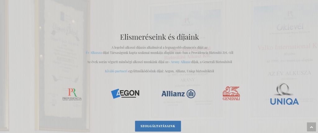 Judittal beszélgetve, az ügyfélfogadó szoba kanapéján ücsörögve megkérdezem, hogy végül is mi az, amire a legbüszkébb a cég történetéből, amire egyszerűen a fejem fölé mutatott, ahol egymás mellett sorakoztak a legnagyobb biztosítótársaságok elismerő oklevelei, illetve a polcon a szintén elismeréseket megörökítő szobrocskák, plasztikák. Ez a legfontosabb üzenet. Meg is örökítettem az új weboldalon.