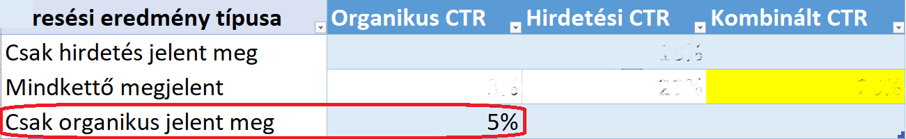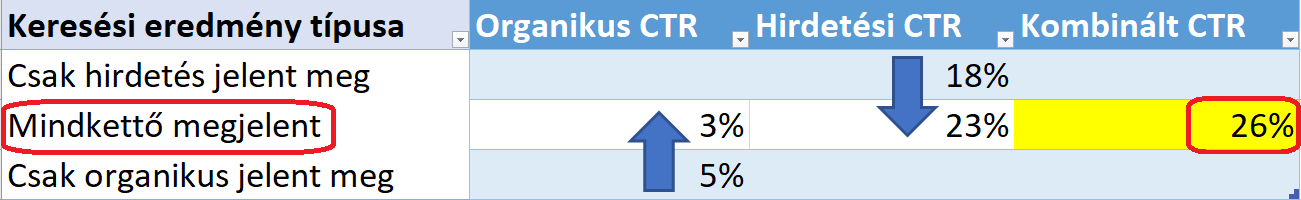 Itt a legmeglepőbb eredmény: ha hirdetést alkalmazunk, miközben SEO-zzuk is az oldalt, akkor még jobb eredményt érünk el: Összeadódnak az organikus és hirdetési átkattintások, és 26%-os átkattintást érünk el.