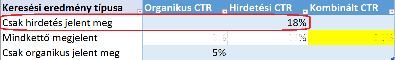 Ha csak hirdetések jelennek meg, akkor az átkattintás 18% – sokkal több, mint csak organikusnál. Úgy látszik, mintha érdemes lenne csak hirdetni, mert az sokkal hatékonyabbnak látszik, mint a SEO.