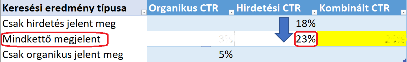 Tehát szükséges a SEO is és a fizetett hirdetés is, mert 5+18=23% helyett 3+23=26%-os átkattintást értünk el SEO és hirdetés együttes használatával.